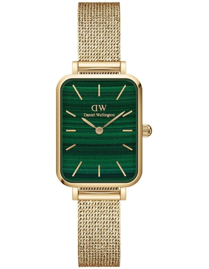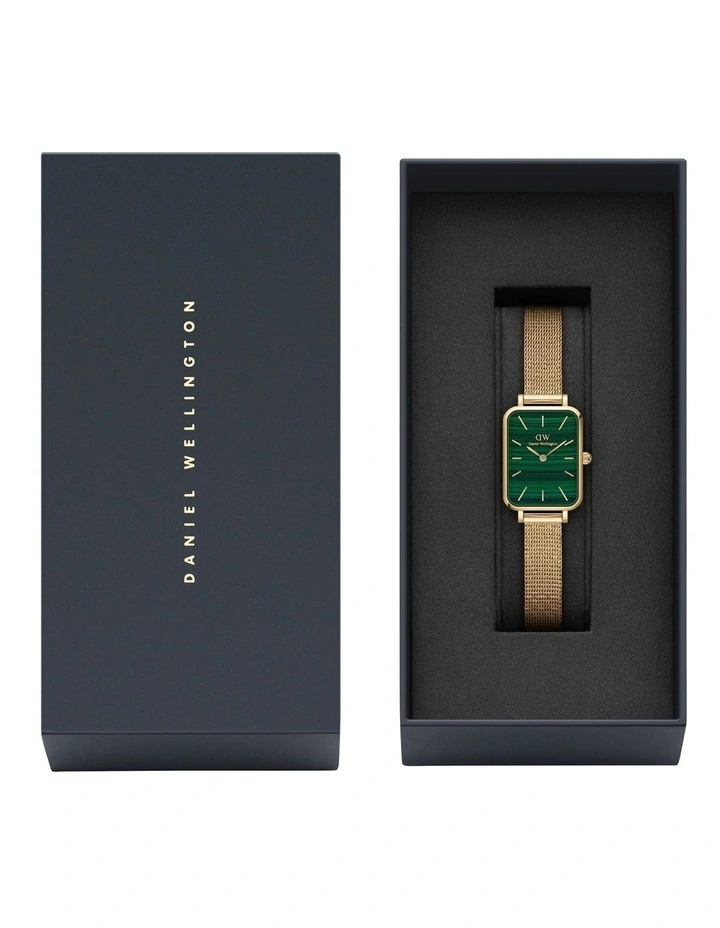 The Quadro Pressed Evergold from Daniel Wellington is beautiful from all the anglespun intended! This womens gold watch brings together our signature square, green watch face and a refined gold mesh bracelet. This is crafted from stainless steel with a gold finish, woven in a glistening fabric-like texture that feels pleasant on the wrist. So, when you want to give your look a bit of an edge, choose this timepiece or another from our collection of angular green dial watches.Β