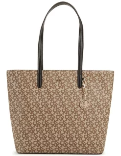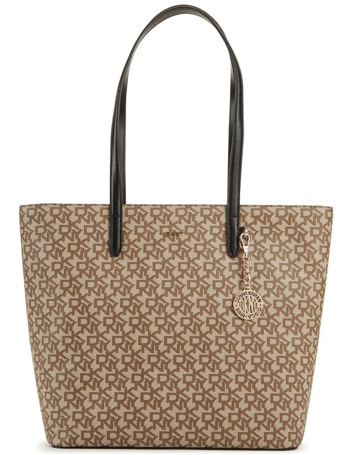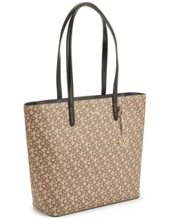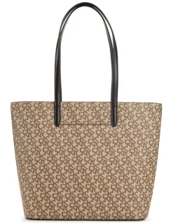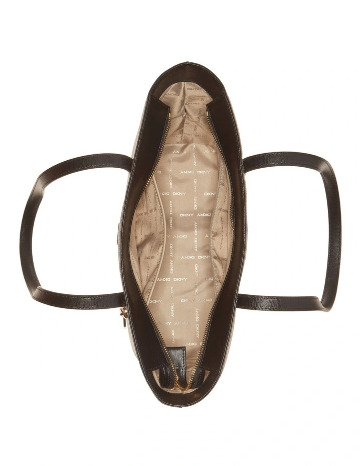 Logo detailed north south tote featuring secure zip top closure and double flat shoulder straps.Β