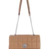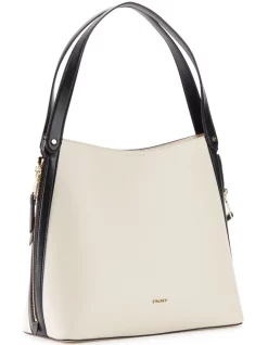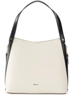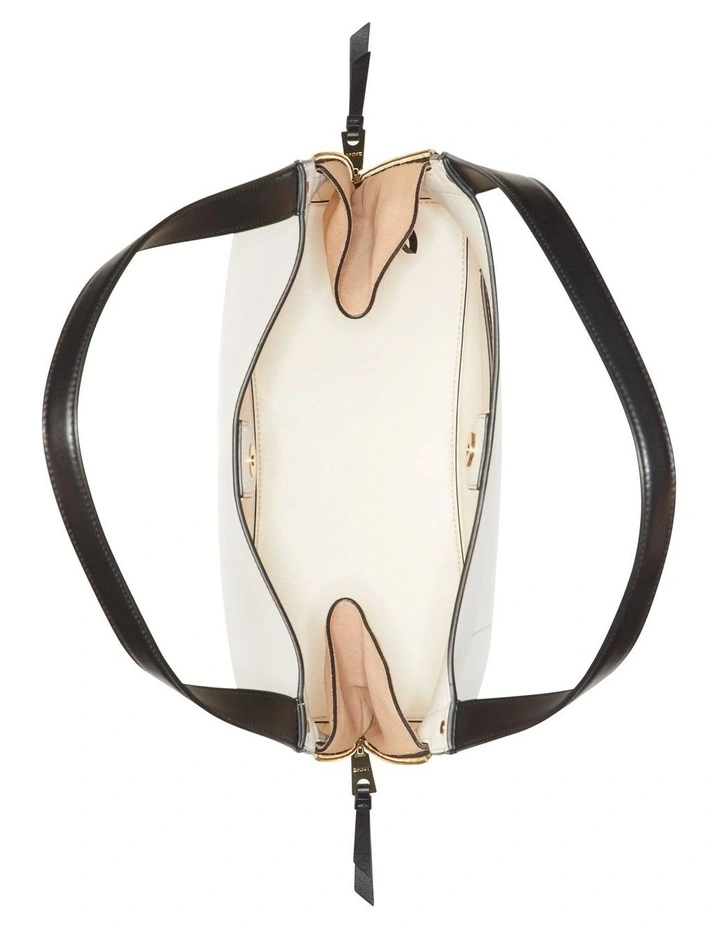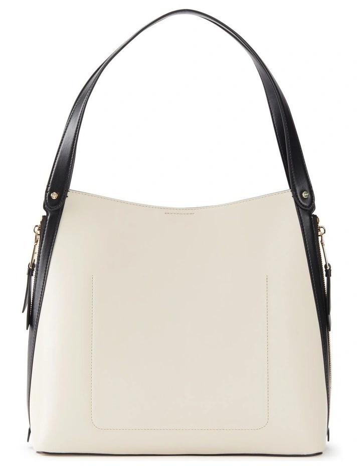 Genuine leather shopper featuring color block and suede detailing, zipper accents, and double flat shoulder straps. Gold tone hardware.