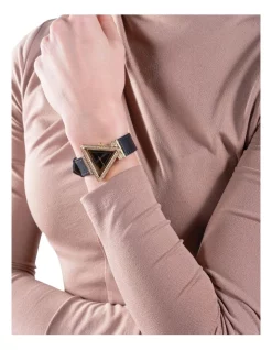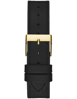 Drawing inspiration from the signature GUESS triangle, this unique silhouette is perfect for our fashion-forward female. A 34mm gold-tone stainless steel case outlines a transparent mineral crystal case-back, paired back with a black smooth leather strap, creates a new statement look for the brand.