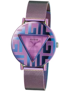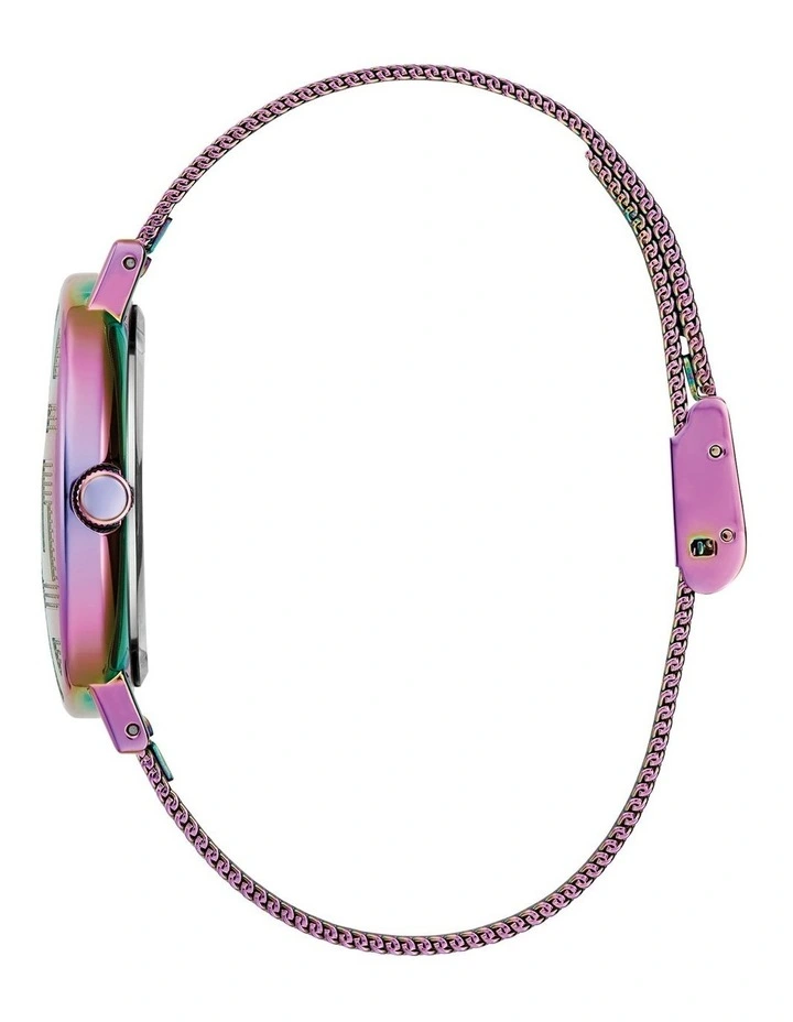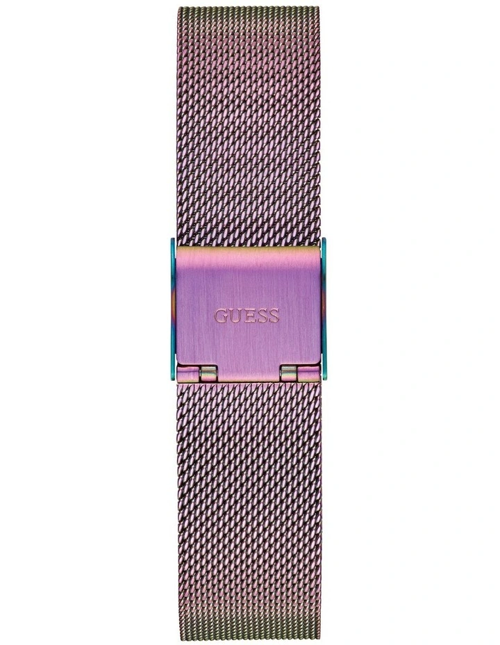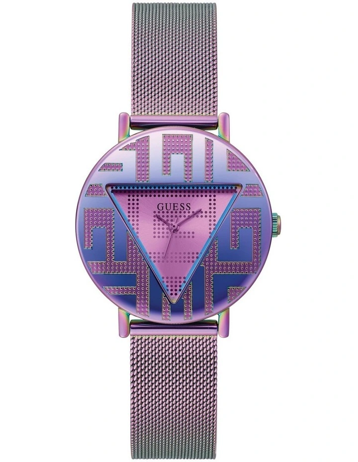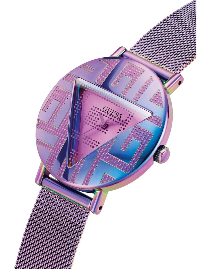 Packed full of our signature elements, the GUESS ICONIC is the perfect piece for the Guess Girl. An engraved pattern featuring our G logo adorns the 36mm iridescent case and dial, which is framed in our signature triangle logo & sits perfectly upon a classic mesh strap.