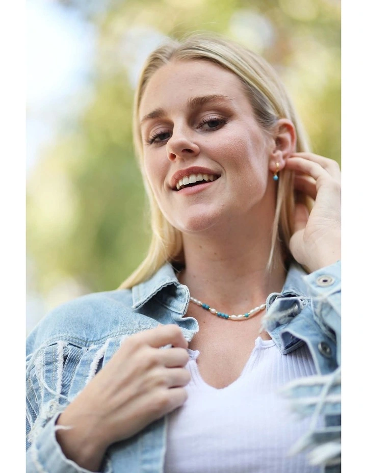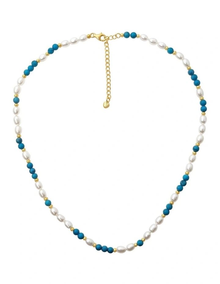4-4.5mm White Cultured Freshwater Pearl with Reconstructed Turquoise Accents, 14ct Gold Plate over Sterling Silver Necklace – 40cm to 45cm with extension chain to adjust length to suit your neckline.