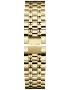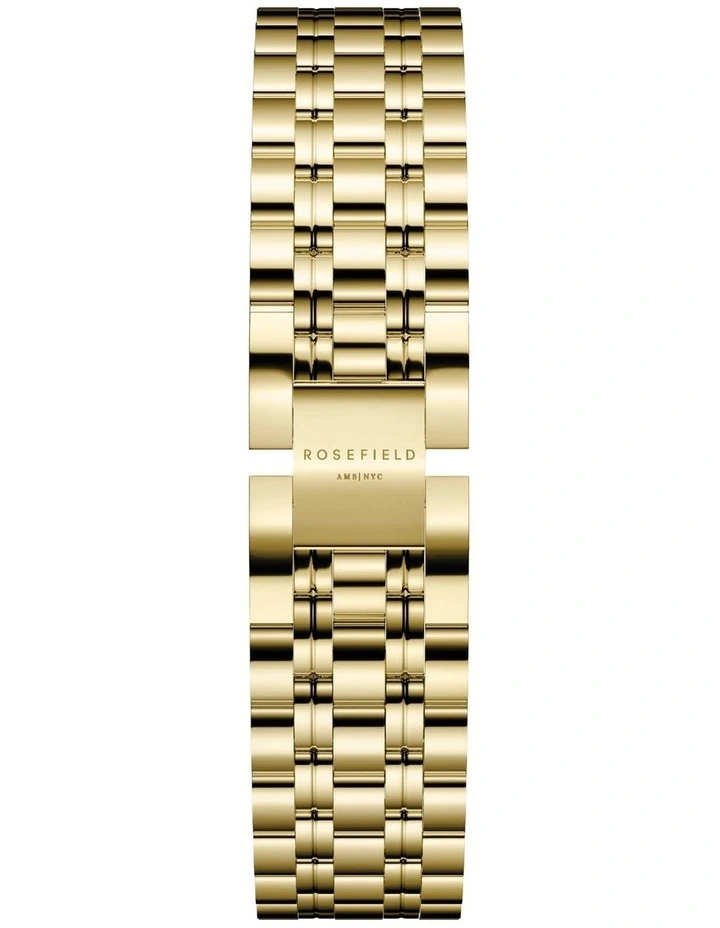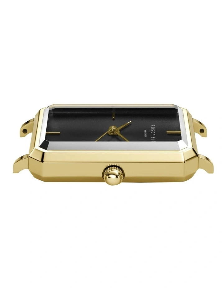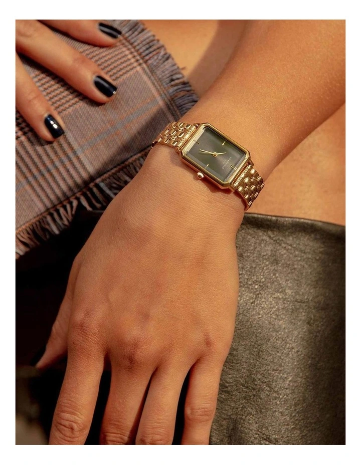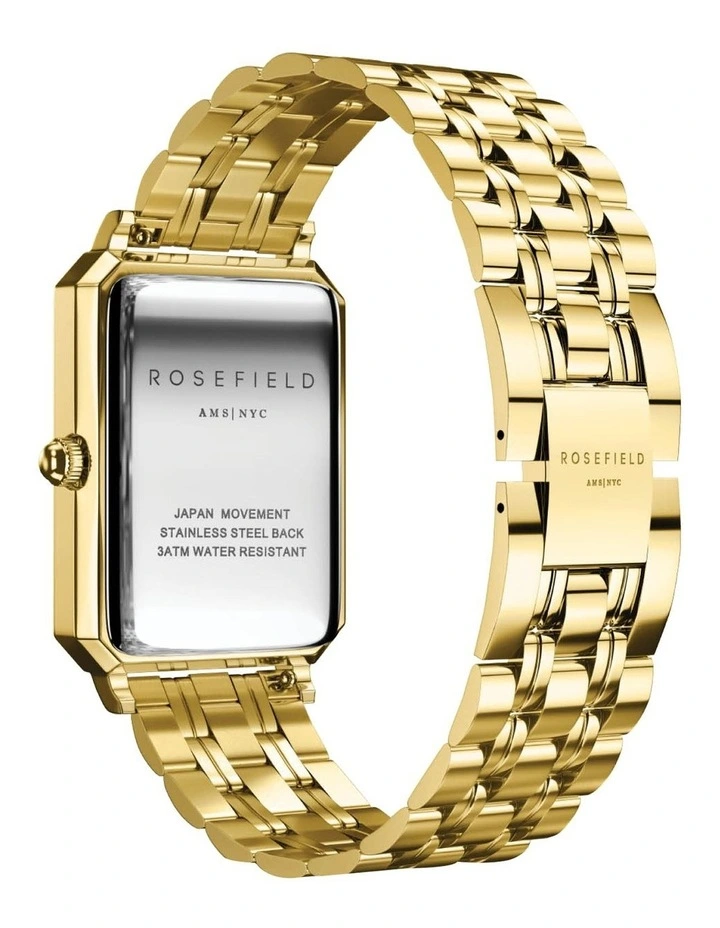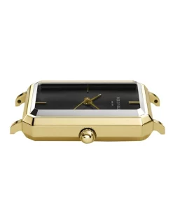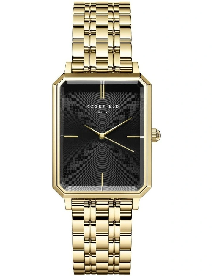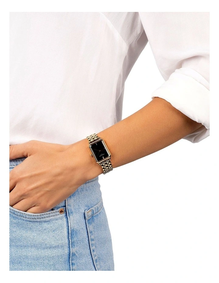 The Rosefield Elles features the new rectangular case in gold tone with black dial and gold tone bracelet strap.