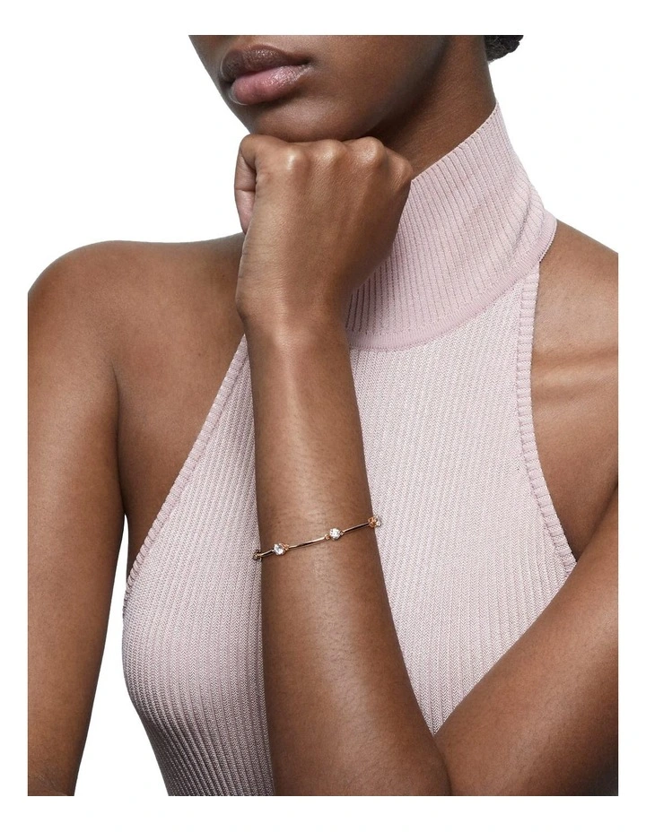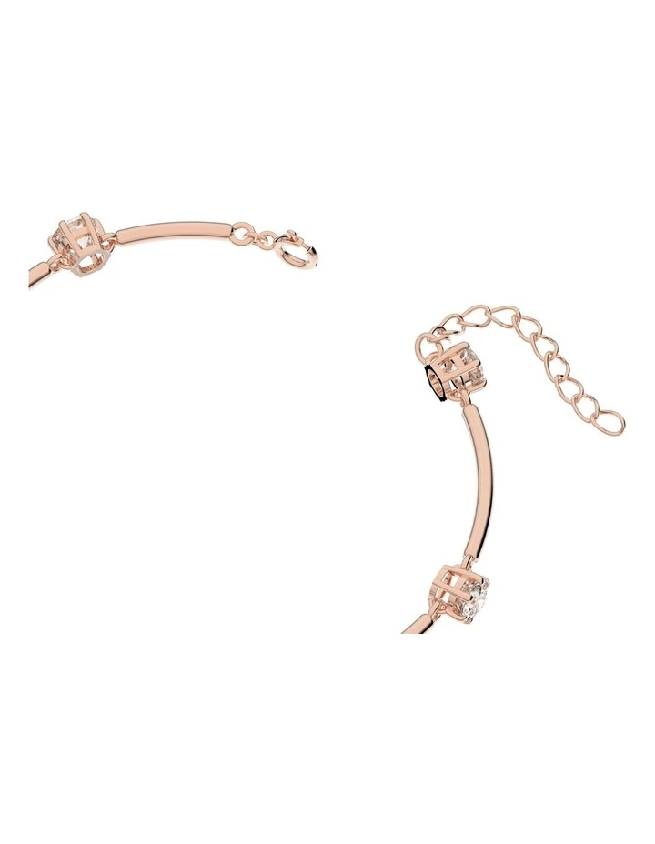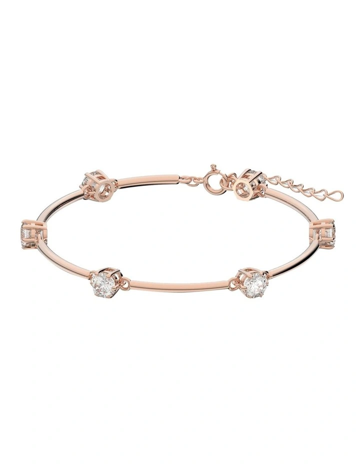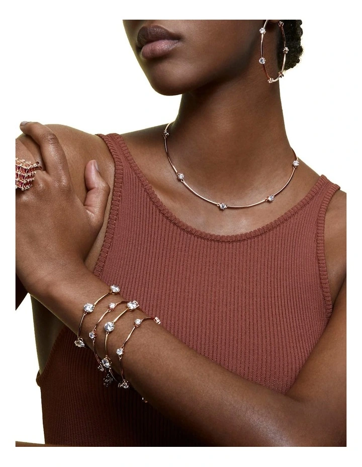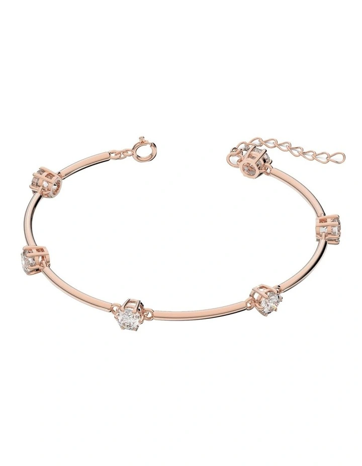 This bangle bracelet is designed to be as delicate as stardust, formed from a row of round, brilliant cut stones inspired by the classic solitaire. Cradled in prong settings on a rose gold-tone plated band, the stones are joined by fine links to create articulated movement with the body. Adjustable in length, elevate an everyday look your own way, with a piece that evokes the wonder of the cosmos. This bracelet is part of the Constella family, designed by Creative Director Giovanna Engelbert for Collection I.